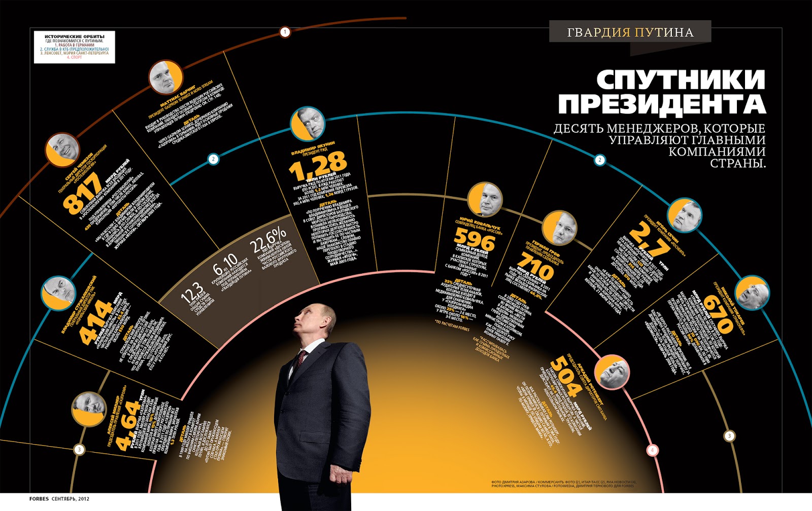 Девять менеджеров путинского призыва фактически контролируют все командные высоты российской экономики — добычу и транспортировку газа и нефти, медиаактивы, крупные строительные проекты, оборонную промышленность и банковскую систему.